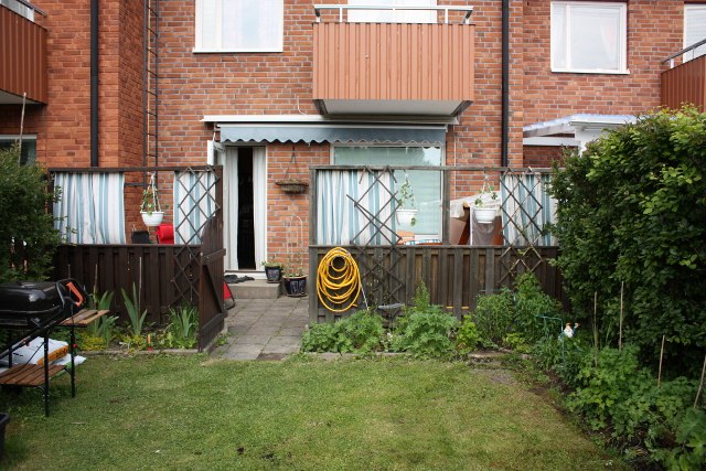 Inser vad lycklig jag är som har en liten plätt där jag kan hålla på med det bästa som finns, dvs blommor och trädgårdsbestyr:) Får plats med en hel del perenner, pallkragar, krukor och dyl. Har ju faktiskt planer på att fixa till en liten damm, och drömmen vore ju att kunna ha ett liiitet växthus till vänster i bild...bortanför grillen:)